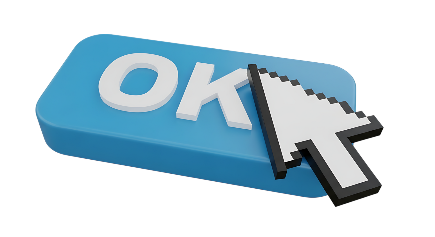 3d rendering of a computer mouse cursor clicking on a blue button with the word ok, isolated on transparent background png