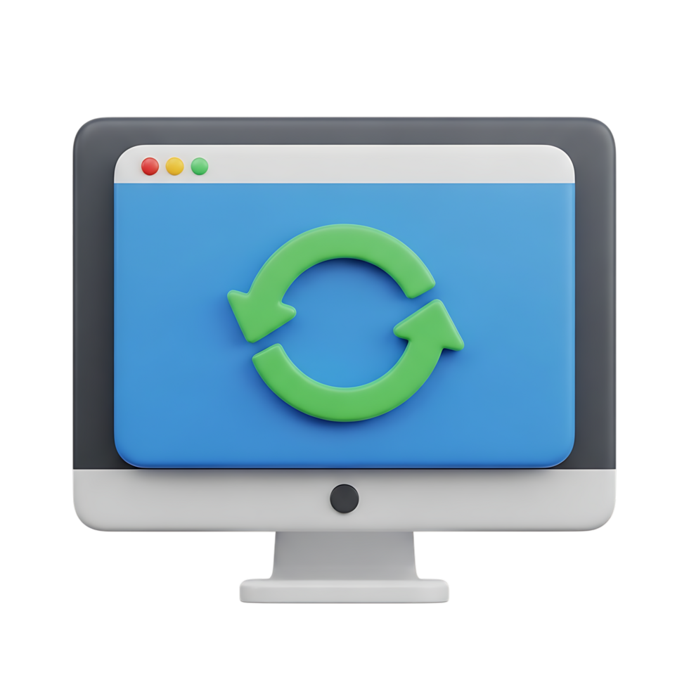 Computer monitor displaying a refresh or sync icon on screen isolated on transparent background png