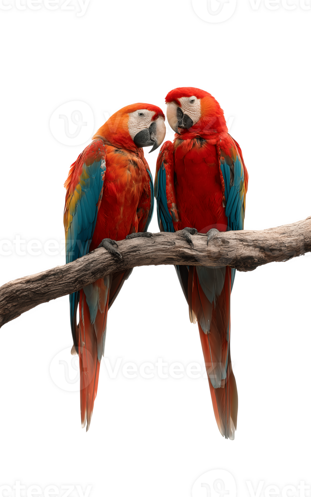 Romantic Pair of Macaws Resting on a Branch, Displaying Affection Pro PNG