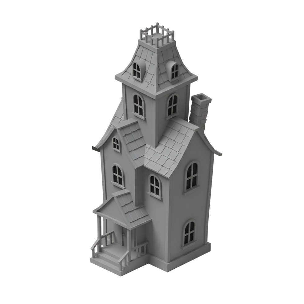 Model house architecture design rendering of a spooky mansion with a tower and many windows design on transparent background png