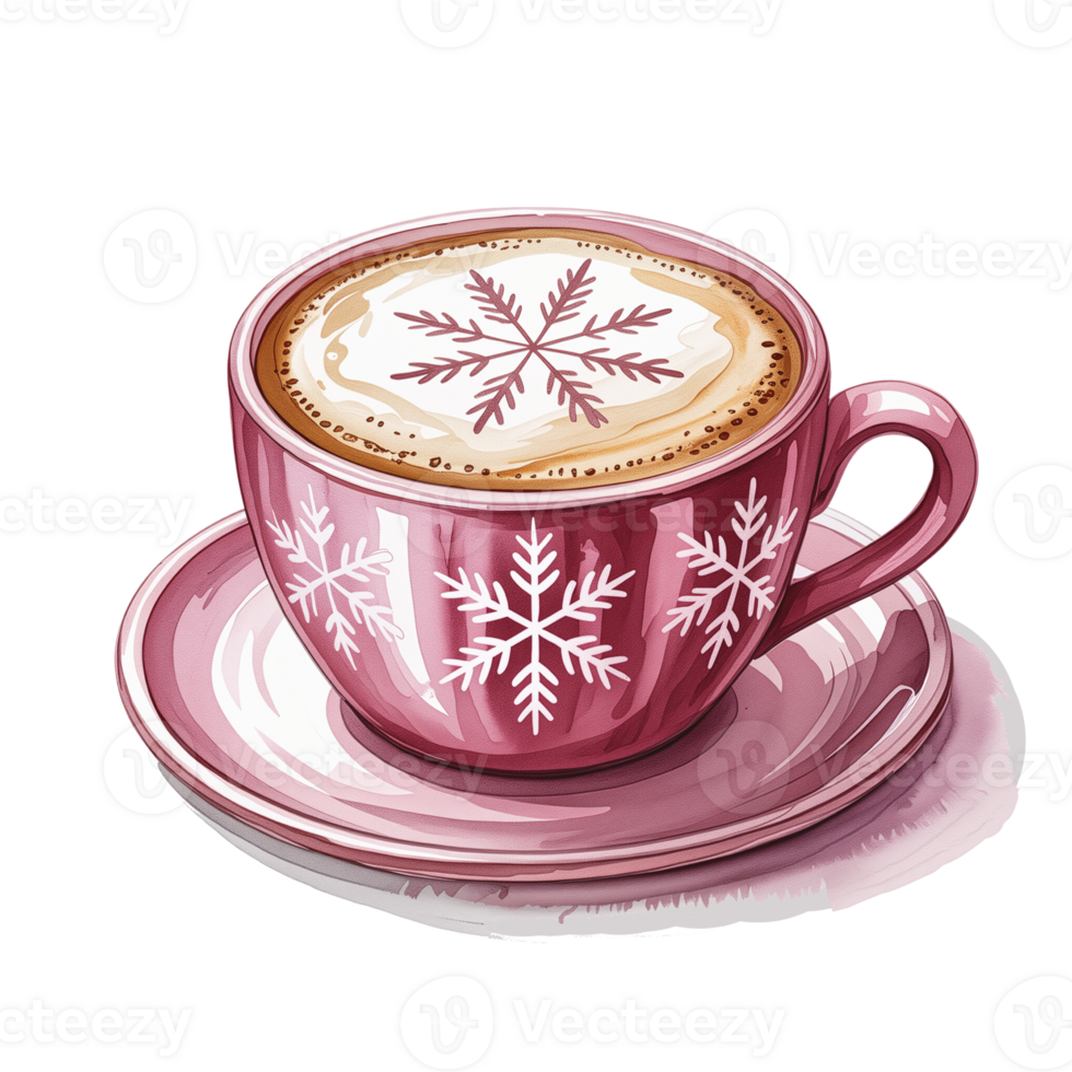 A delicate pink teacup features intricate snowflake designs, complementing the frothy latte art mirroring the snowflake pattern Pro PNG