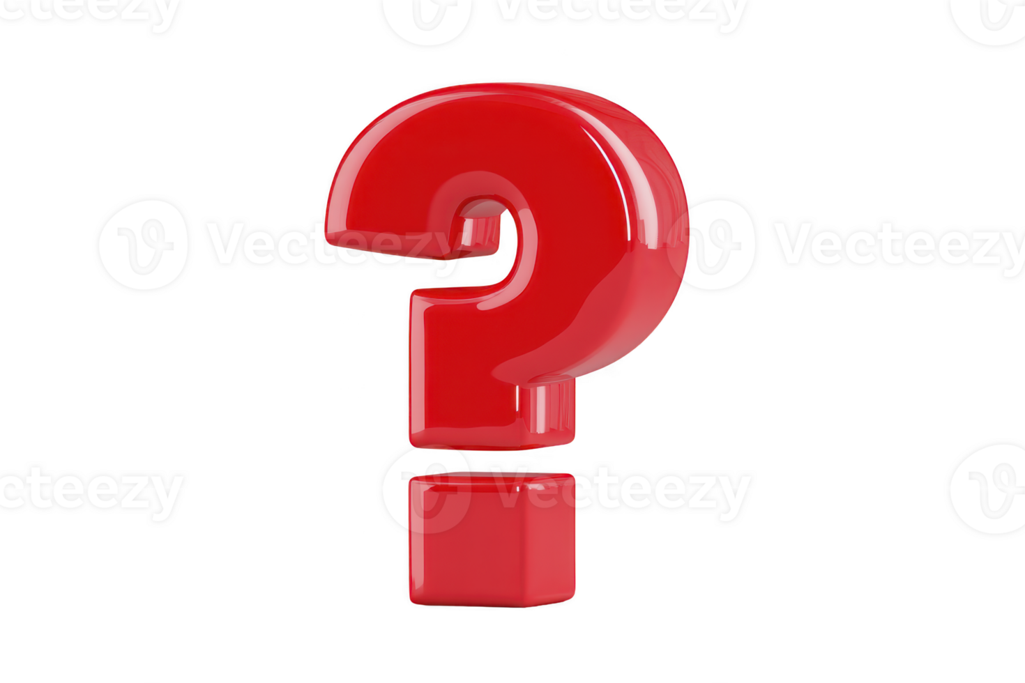 Shiny red 3D question mark stands upright against plain background, symbolizing inquiry and curiosity. glossy finish adds modern touch, making it visually striking Pro PNG