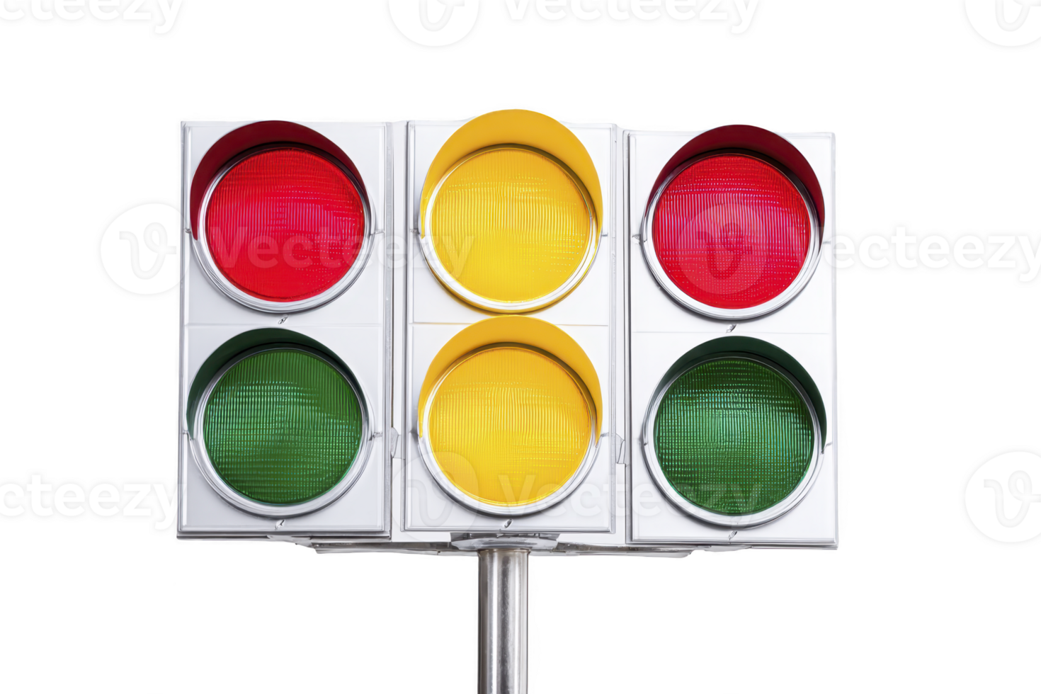 Traffic light with three sets of red, yellow, and green lights is displayed against transparency background. lights are arranged in grid pattern, commonly used for traffic control Pro PNG
