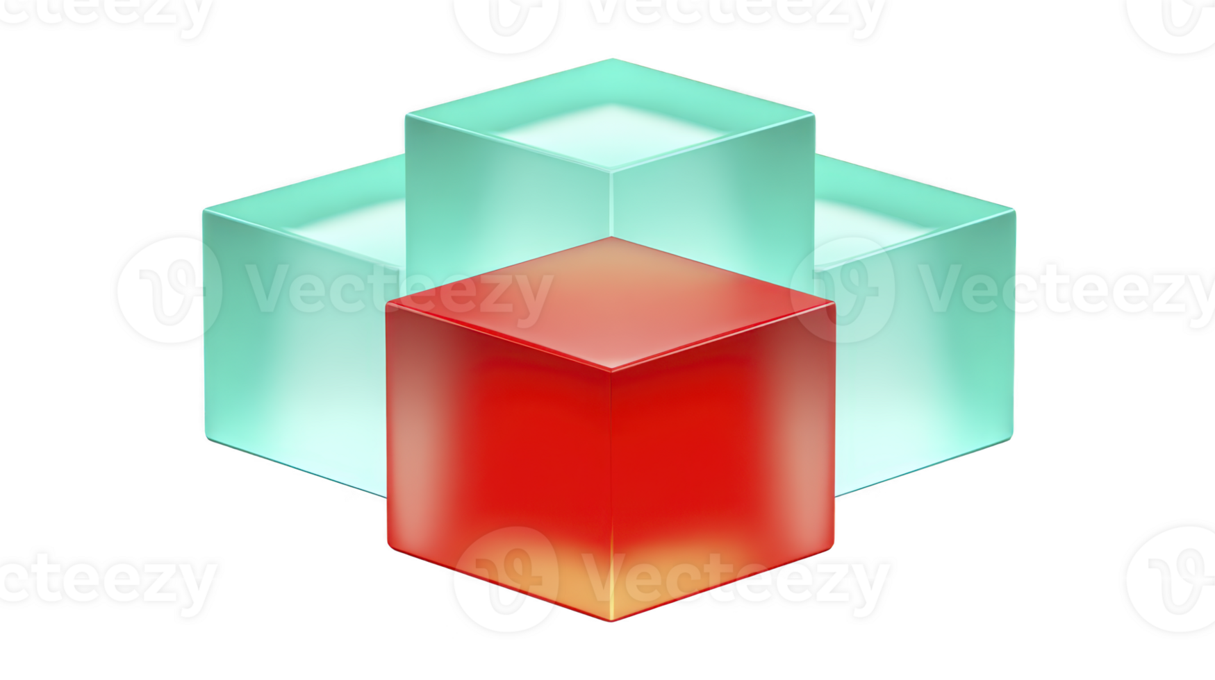 3D illustration of four translucent cubes, three in light blue and one in red, arranged in geometric pattern. cubes have glossy finish, creating modern and abstract design Pro PNG
