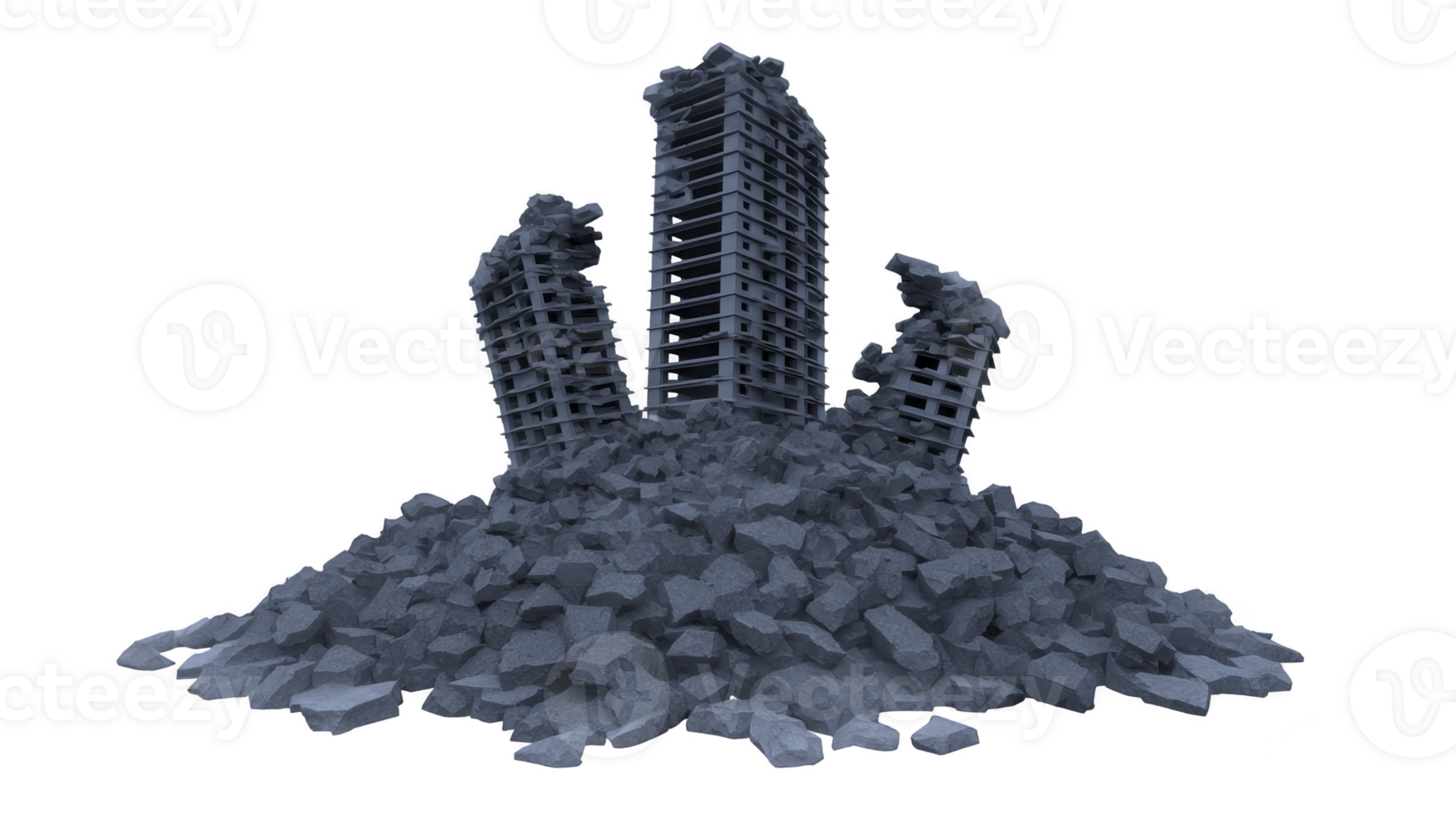 Demolished buildings surrounded by rubble create scene of destruction and chaos. crumbled structures stand as testament to power of demolition, evoking feelings of loss and change Pro PNG