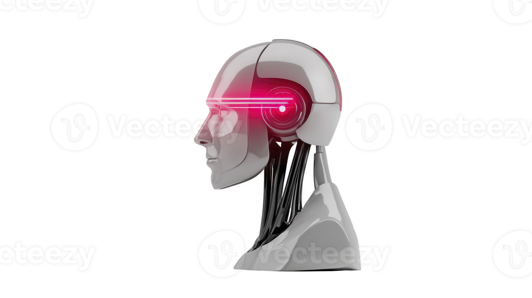 Futuristic robot head with sleek design features shiny surface and glowing red eyes, symbolizing advanced technology and artificial intelligence. profile view highlights its modern aesthetic Pro PNG