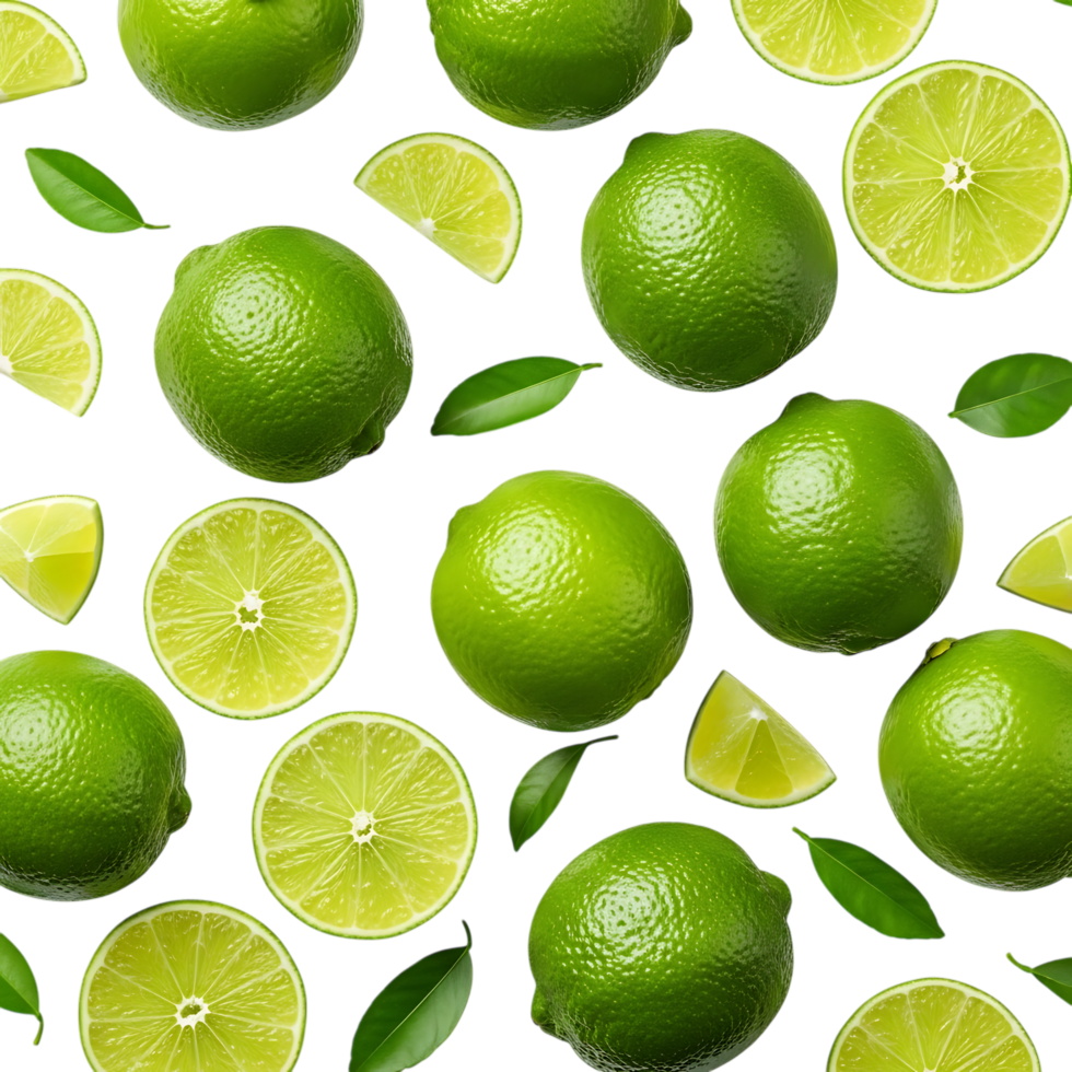 Fresh limes isolated on transparent background, a vibrant pattern of whole and sliced fruits, perfect for adding a zesty touch to any design or culinary project png
