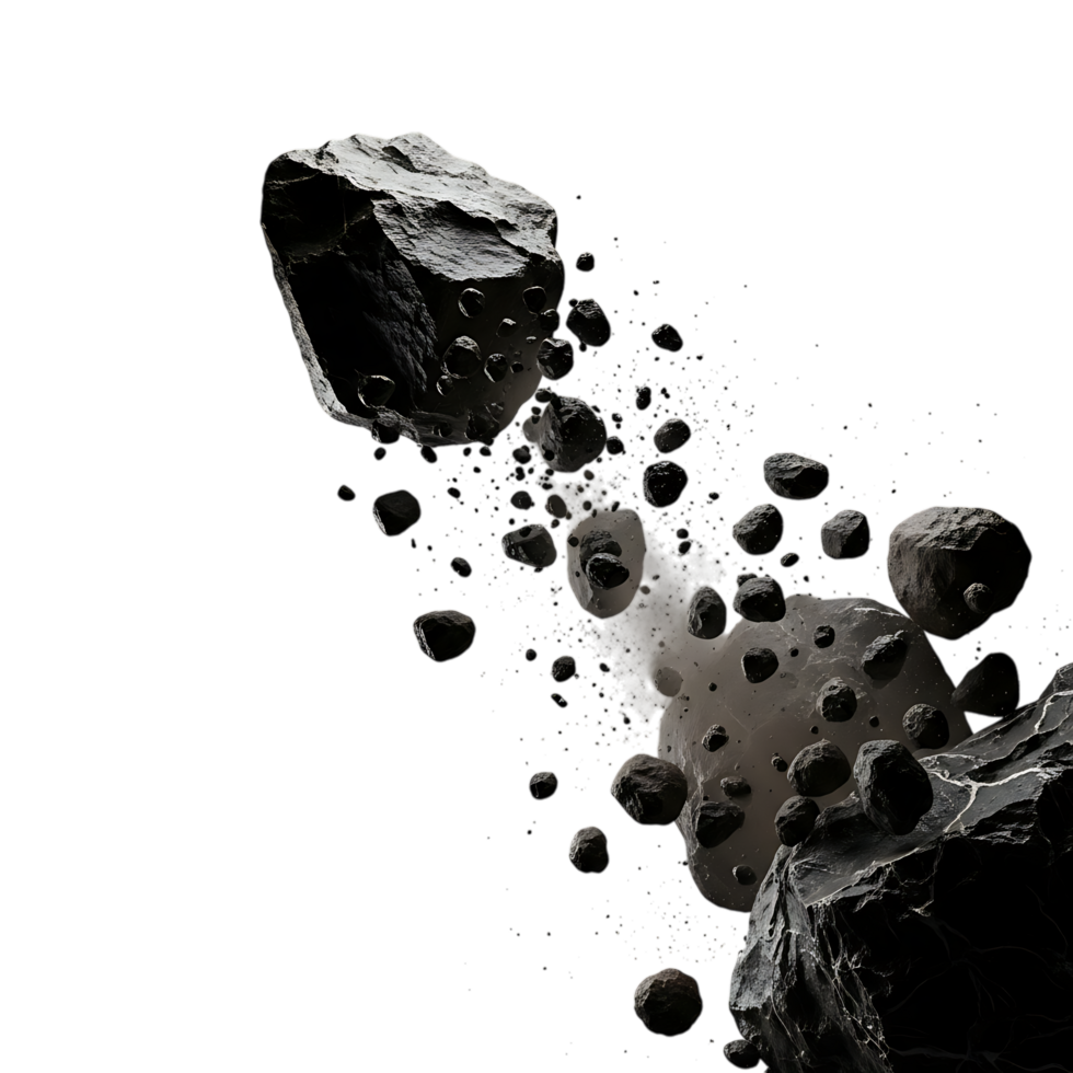 A dynamic scene of dark asteroids hurtling through space, isolated on transparent background, creating a sense of cosmic motion and potential impact png