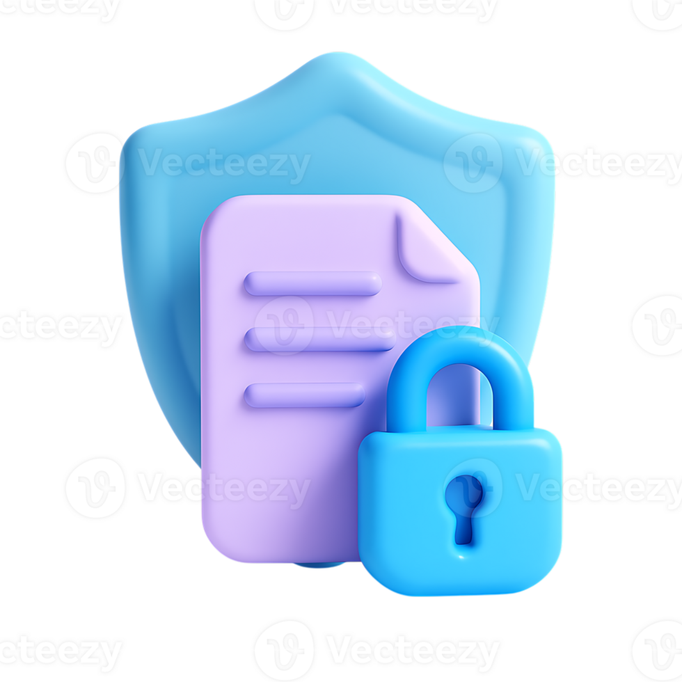 A 3d rendering of a document icon secured with a lock and shield, isolated on transparent background Pro PNG
