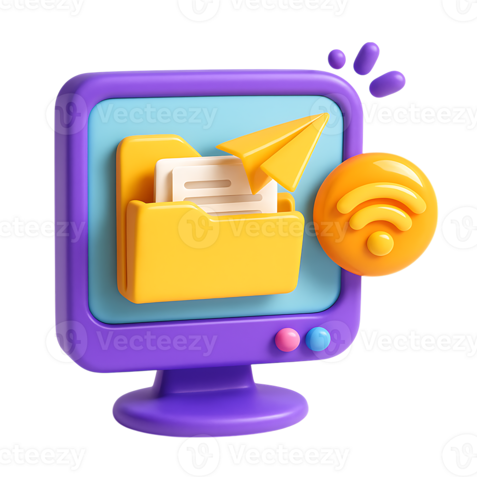 A 3d rendering of a computer screen showing a folder with a document and a paper airplane, isolated on transparent background Pro PNG