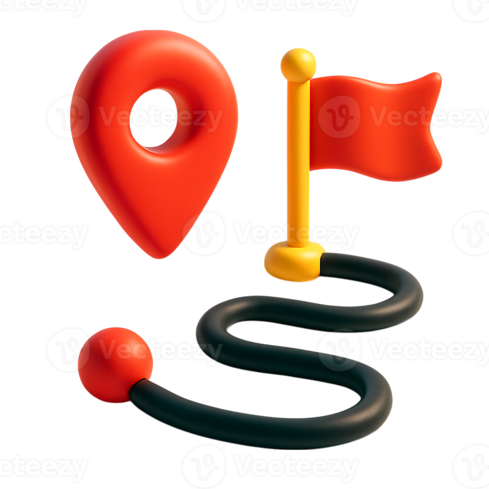 A 3d rendered map icon with a location pin, flag, and path, isolated on transparent background Pro PNG