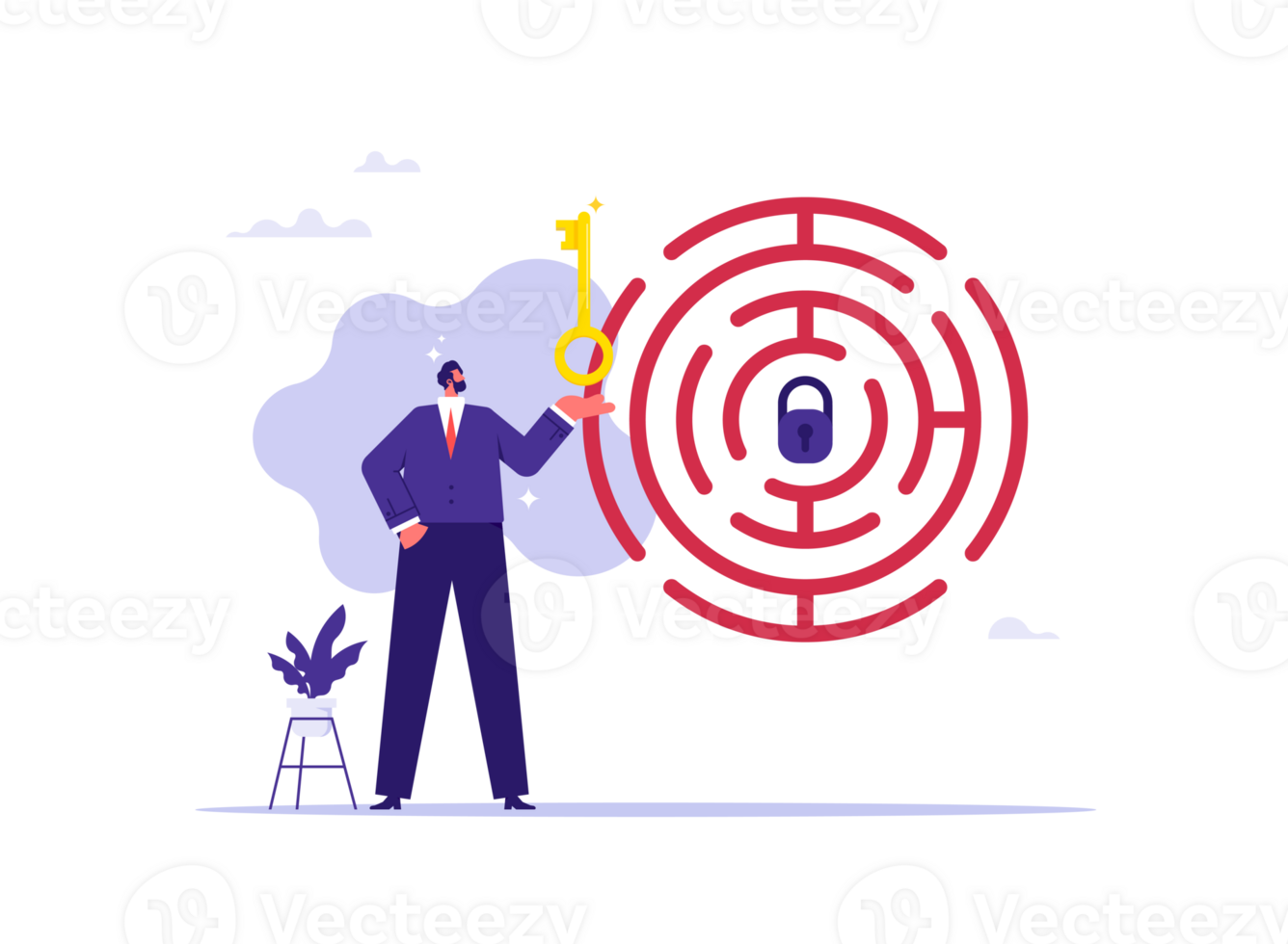 Solution searching and solving problem concept, businessman holding key and thinking how to pass the maze and unlock padlock, looking for answers Pro PNG