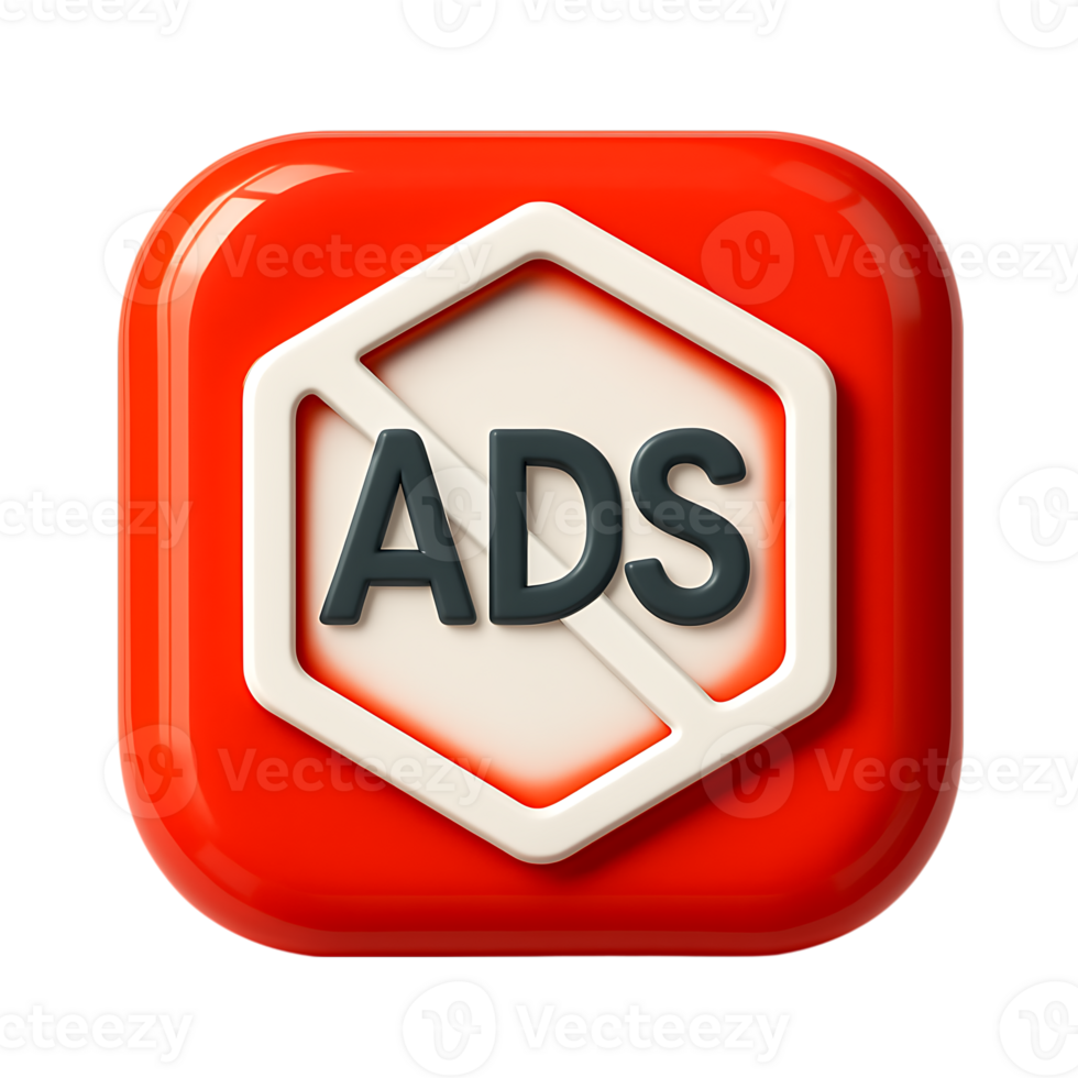 A red square button with a white hexagon and the word ads, isolated on transparent background Pro PNG