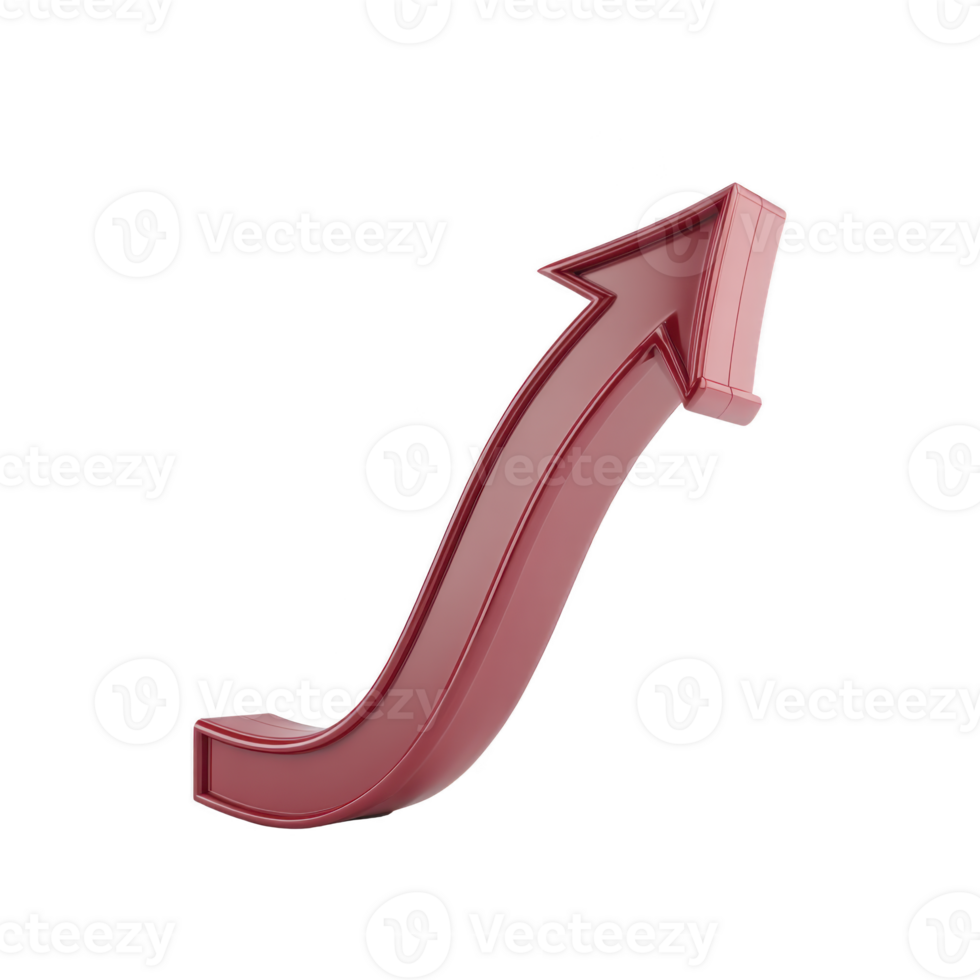 Shiny red 3D arrow curves upward, symbolizing growth and progress. arrow sleek design and vibrant color convey sense of dynamic movement and positive direction Pro PNG