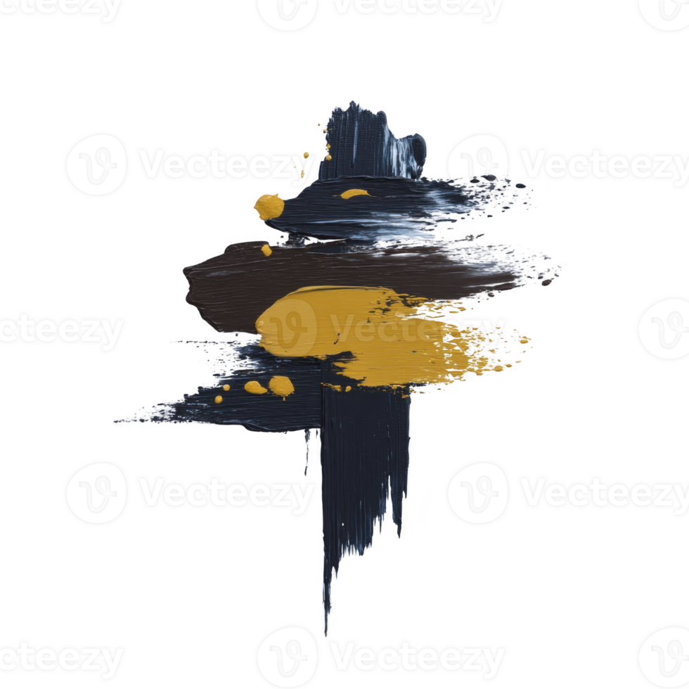 Dynamic abstract painting features bold brushstrokes in black, blue, and gold, creating striking visual impact. composition is expressive and modern, with splashes of color adding depth Pro PNG