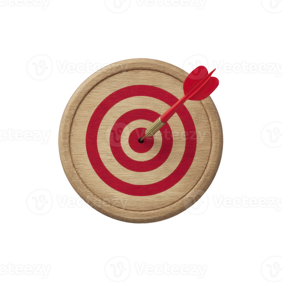 Wooden dartboard with red concentric circles and red dart in bullseye symbolizes precision and success Pro PNG