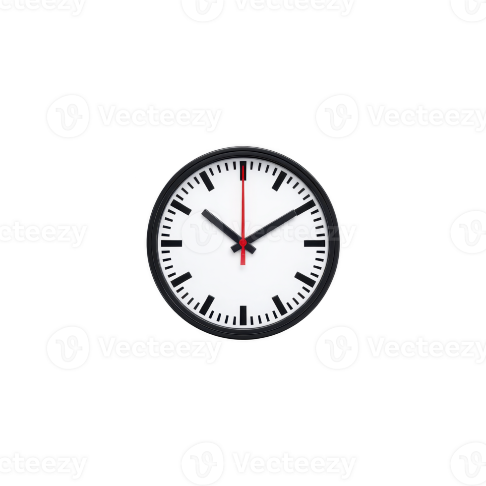 Round wall clock with white face, black hour and minute hands, and red second hand, displaying minimalist design. clock is set against plain background Pro PNG