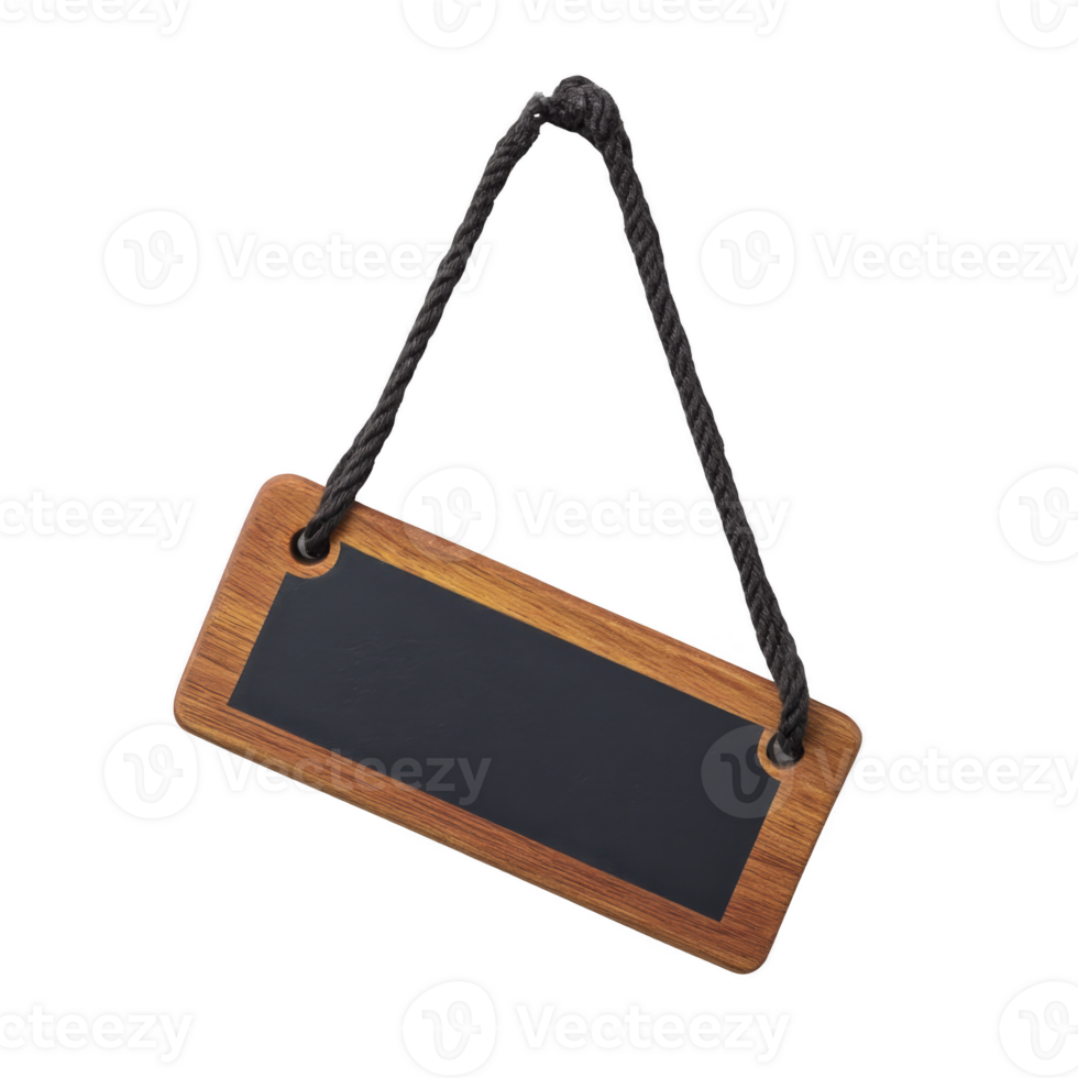 Rectangular wooden sign with black chalkboard center hangs from rope, perfect for customizable messages. rustic design adds charm to any setting Pro PNG