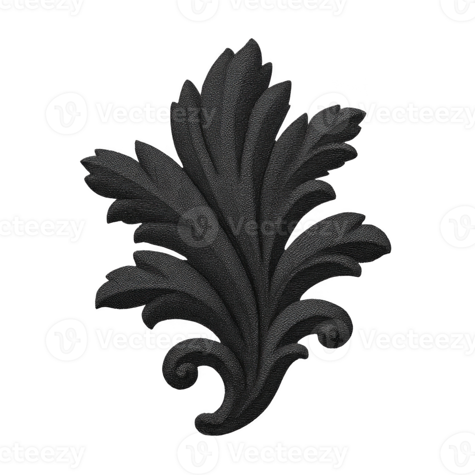 Ornate black leaf design with intricate detailing, showcasing classic and elegant style. leaf features curved lines and textured surface, adding depth and sophistication to decorative element Pro PNG