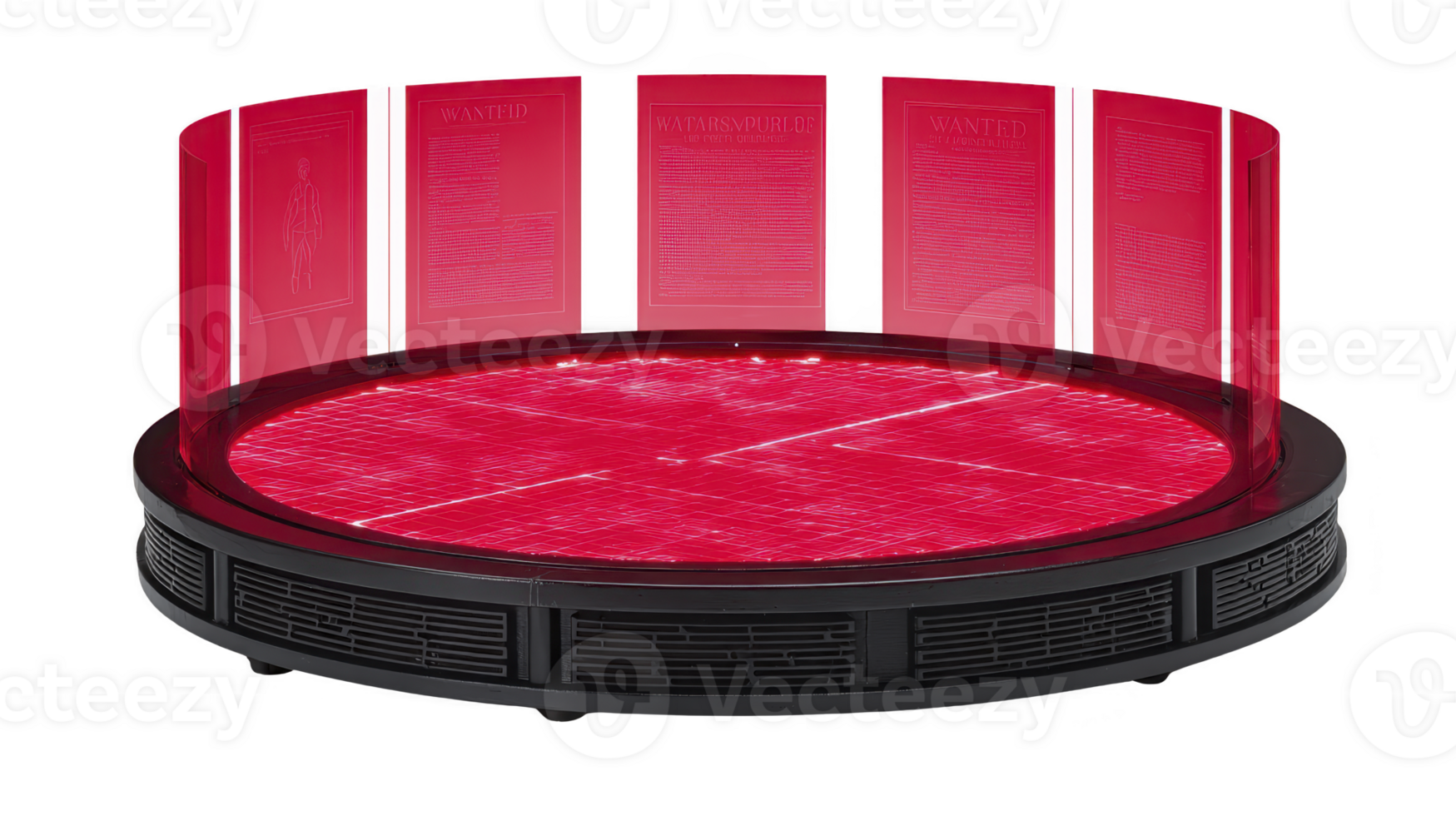 Futuristic, circular display with red transparent panels and black base, possibly used for interactive presentations or exhibitions. panels feature text and graphics, creating high tech atmosphere Pro PNG