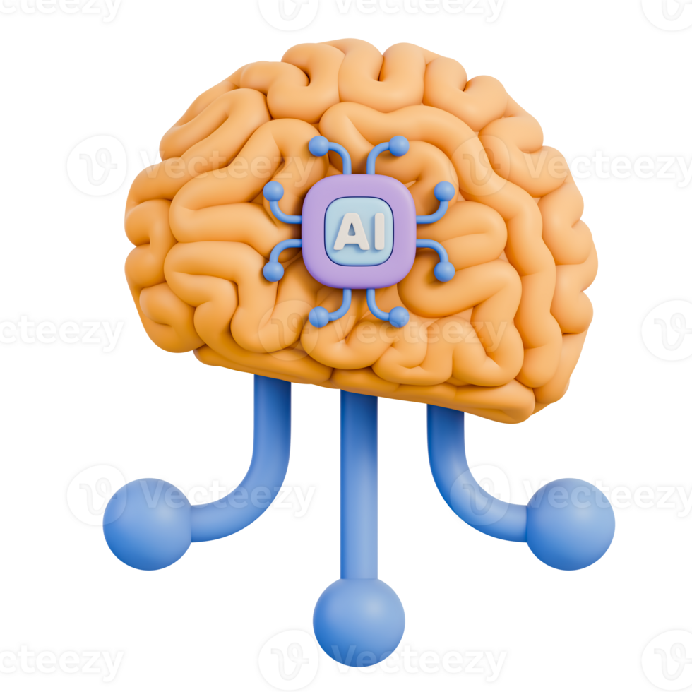 Brain with microchip processor and neural network circuit, AI for machine learning, digital computing, data processing, science research, innovation and technology, 3d illustration Pro PNG