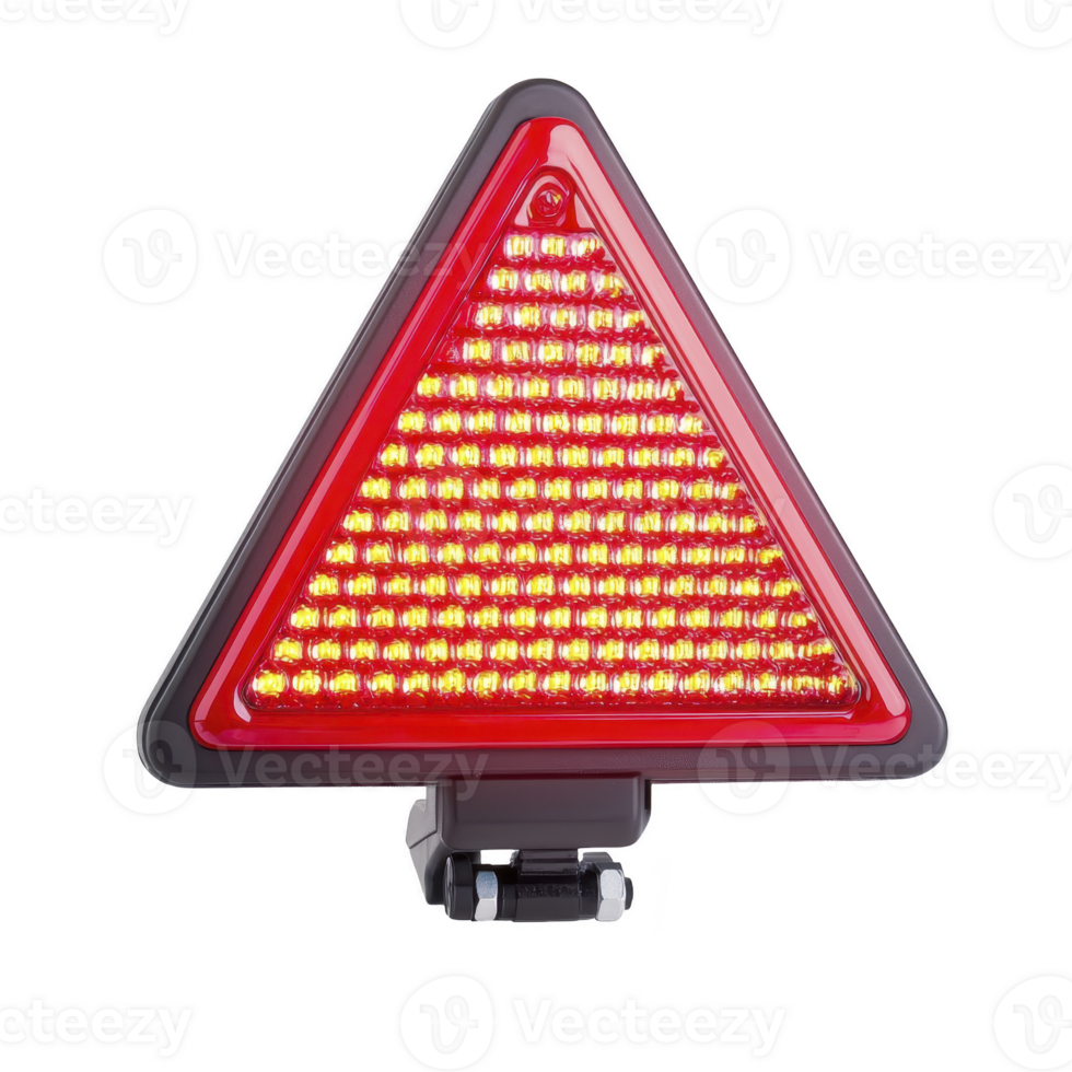 red triangular LED warning light with black frame, designed for safety and visibility, is shown. It features multiple bright LED lights arranged in rows, ideal for emergency situations Pro PNG