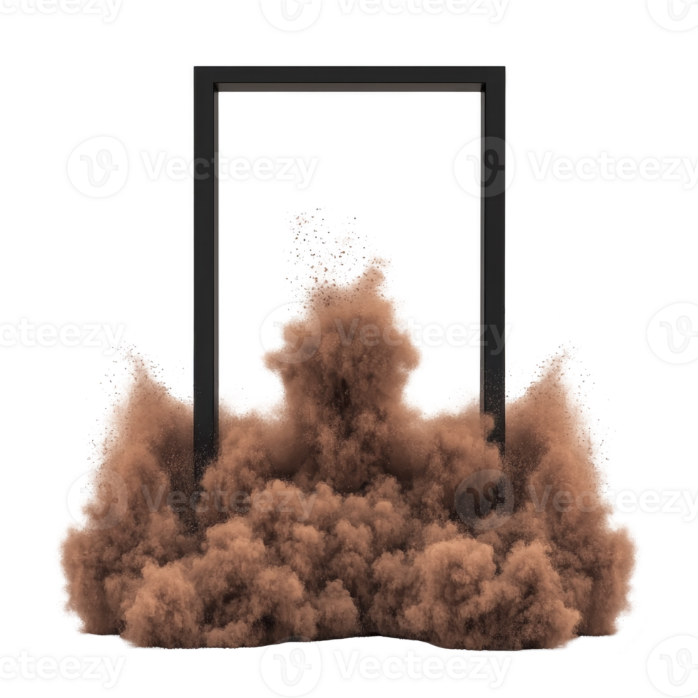 dynamic explosion of brown powder erupts through rectangular frame, creating dramatic and energetic visual effect. contrast between structured frame and chaotic burst adds sense of movement Pro PNG