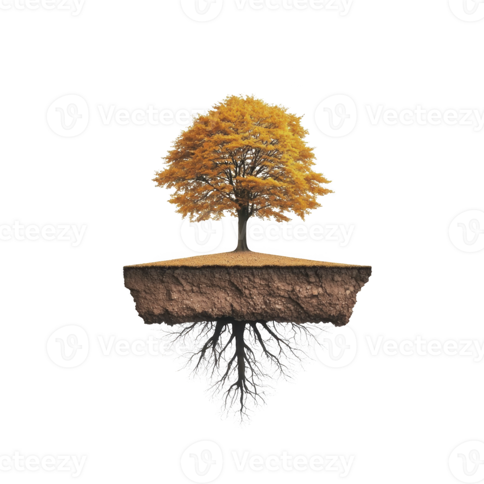 vibrant autumn tree with golden leaves stands on floating piece of earth, its intricate roots visible below, creating surreal and balanced composition Pro PNG