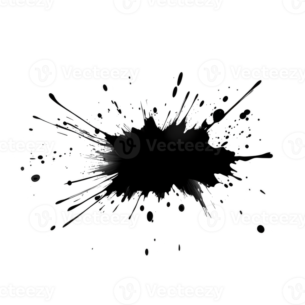 Dynamic black ink splatter with irregular edges and droplets radiating outward, creating abstract and artistic effect. splash is set against transparent background, ideal for creative projects Pro PNG