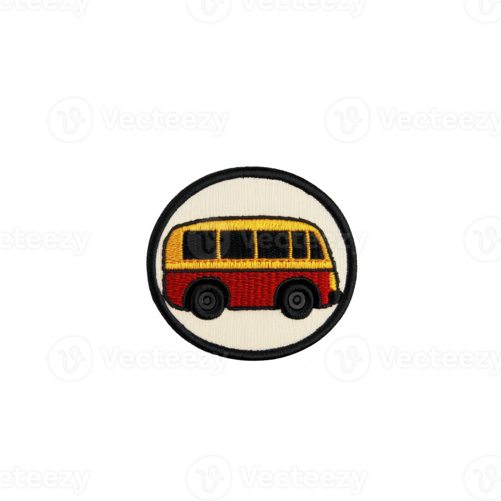 Round embroidered patch features colorful bus design, with red and yellow hues, set against transparency background. patch is outlined in black, adding contrast and definition Pro PNG