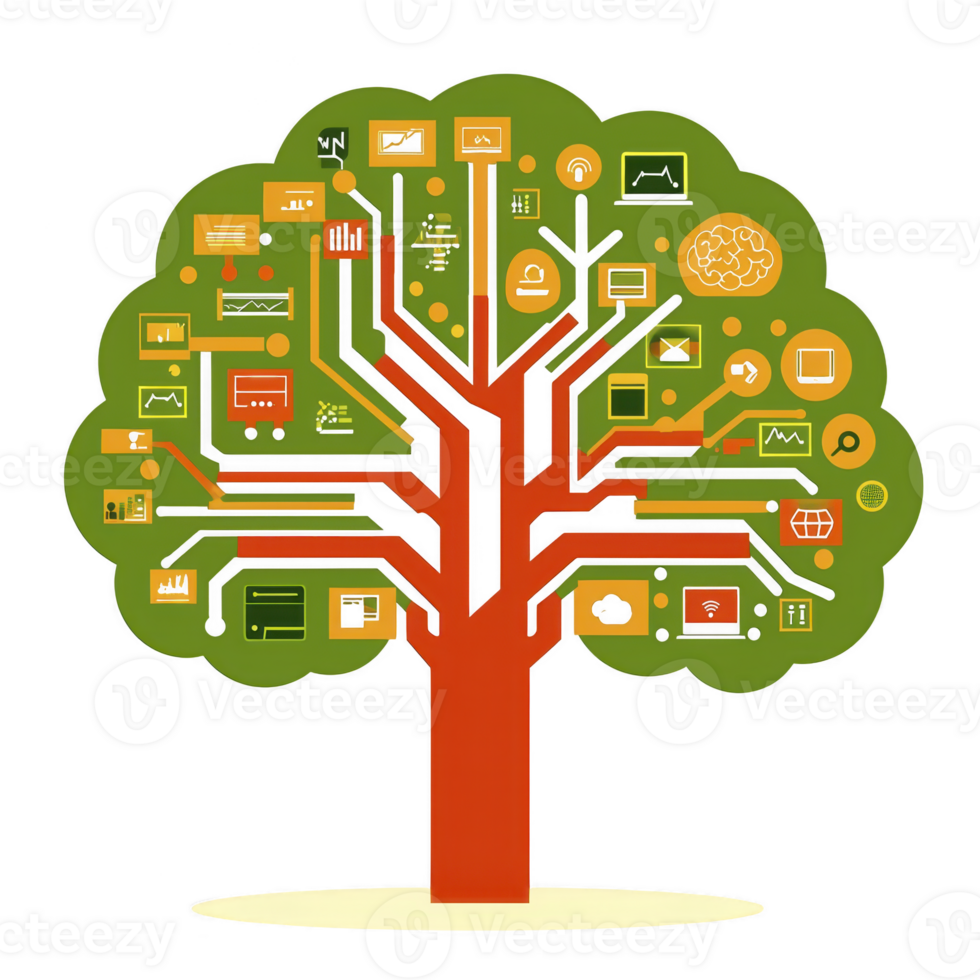 Digital tree illustration with branches connecting various technology icons, symbolizing connectivity and growth in technology. vibrant colors and design convey innovation and creativity Pro PNG