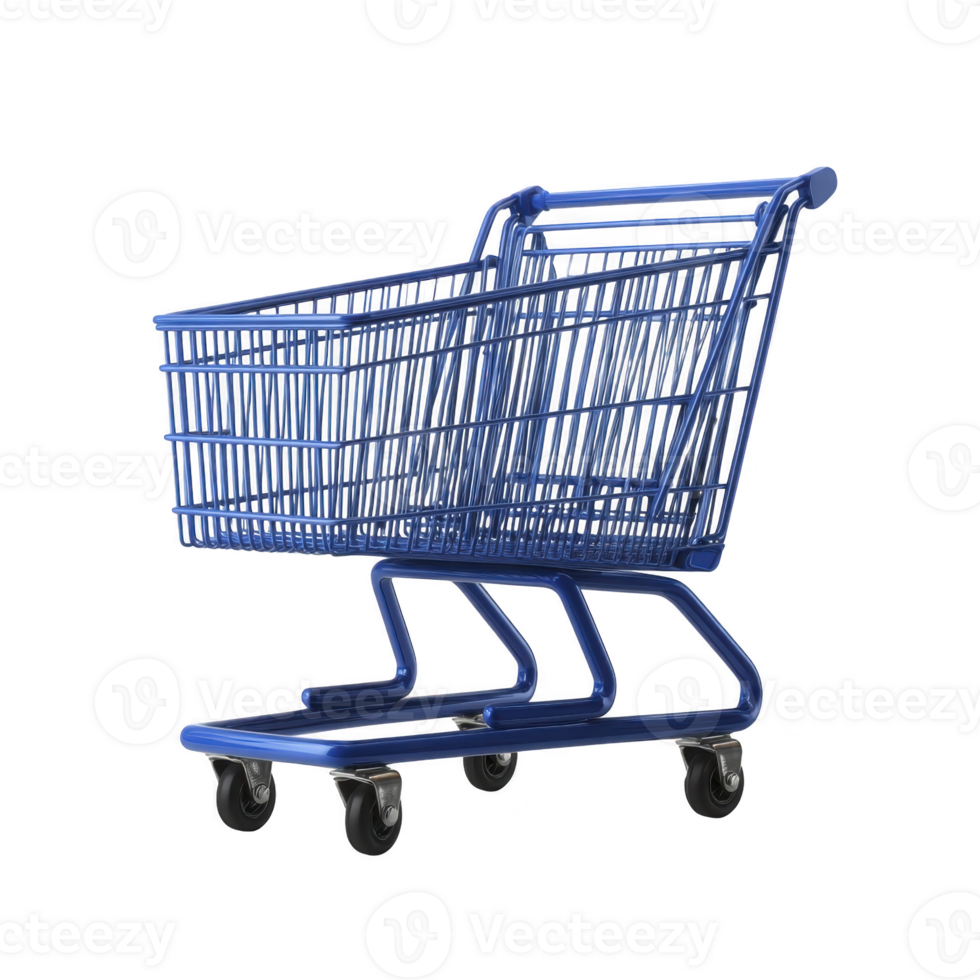 Blue shopping cart with metal frame and four wheels is isolated on transparency background. cart is empty and positioned at angle, showcasing its design and structure Pro PNG