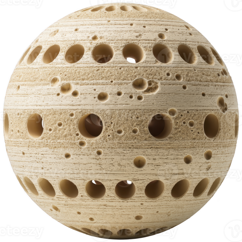 Spherical object resembling planet is covered numerous circular holes, giving it textured appearance. surface is beige, similar to wood or cheese, with varying sizes of holes creating intricate Pro PNG