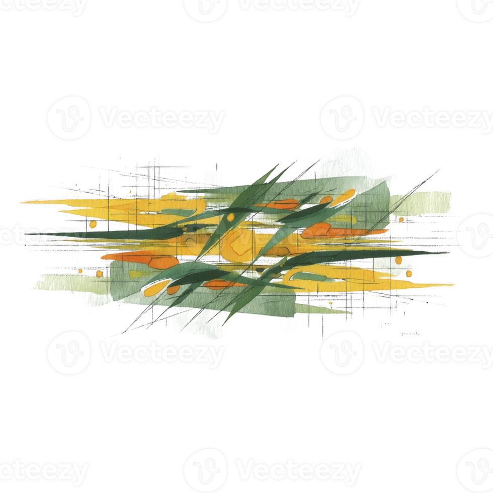 Abstract painting with dynamic brushstrokes in green, yellow, and orange, creating sense of movement and energy. composition features layered textures and intersecting lines Pro PNG