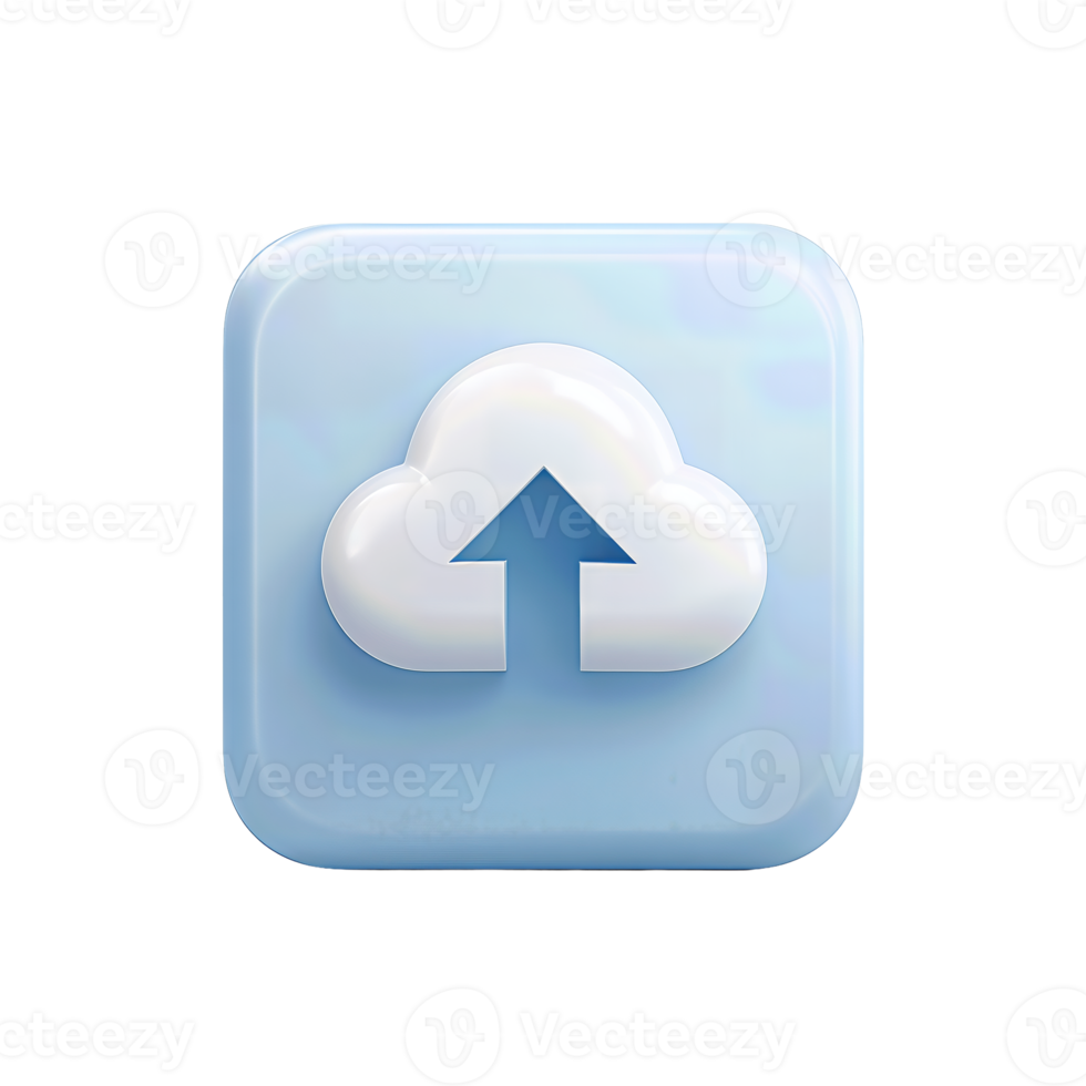 A rounded square app tile with a soft-white cloud and bold slate upward arrow, beveled edges and gentle inner glow, isolated on transparent background. Pro PNG