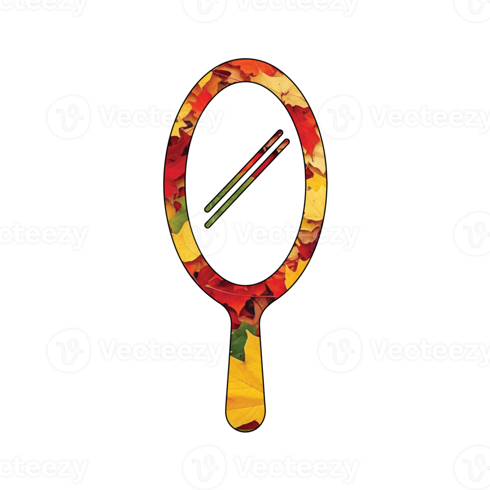 Illustration of a hand mirror with a vibrant autumn leaf pattern, reflecting two green chopsticks, isolated on transparent background, creating a unique design Pro PNG