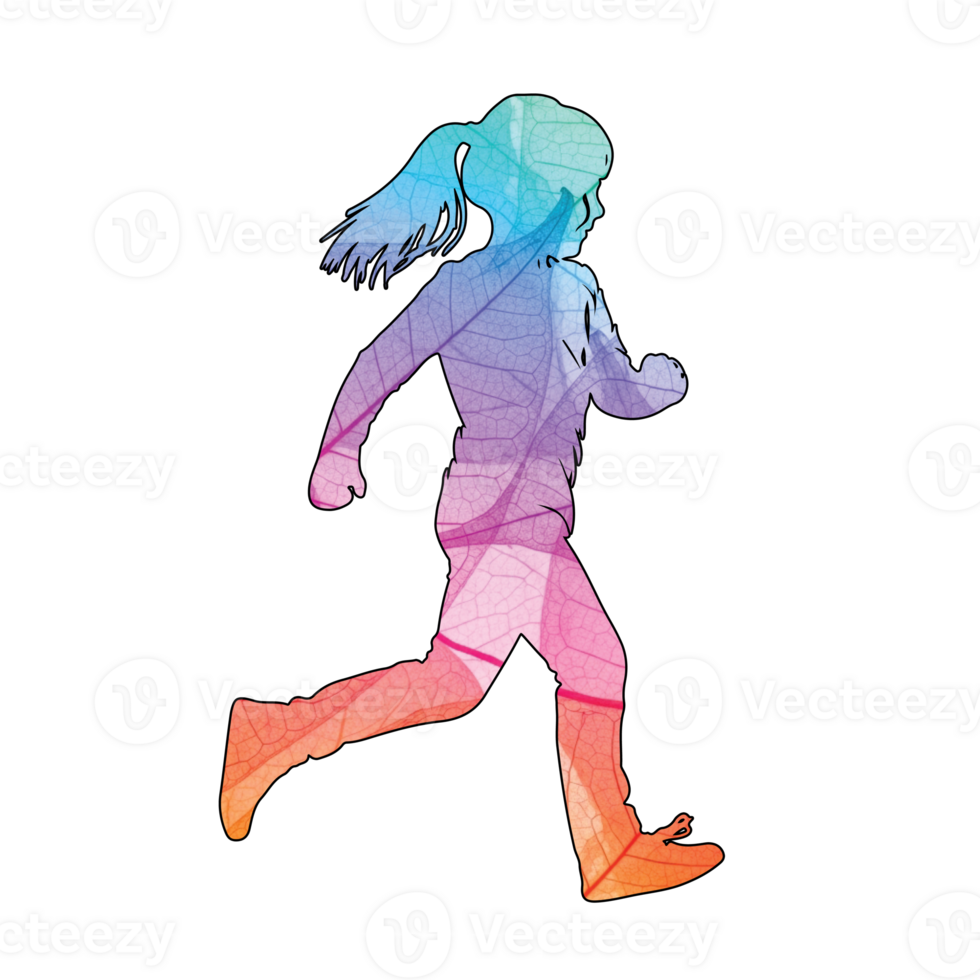 Illustration of running girl silhouette isolated on transparent background, showcasing a colorful gradient and leaf vein pattern within the shape, capturing the essence of motion Pro PNG