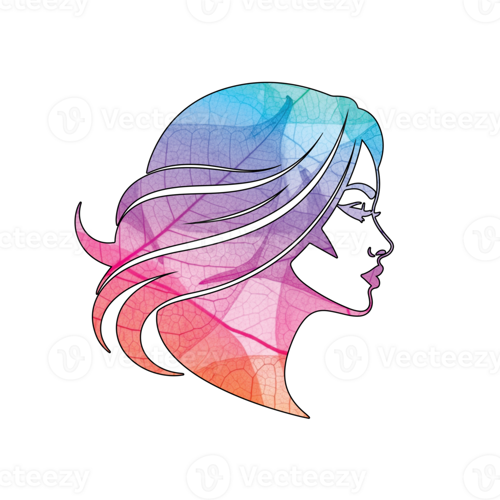 Illustration of a womans face in profile, isolated on transparent background the face and hair are filled with colorful leaves pattern, creating a unique design Pro PNG