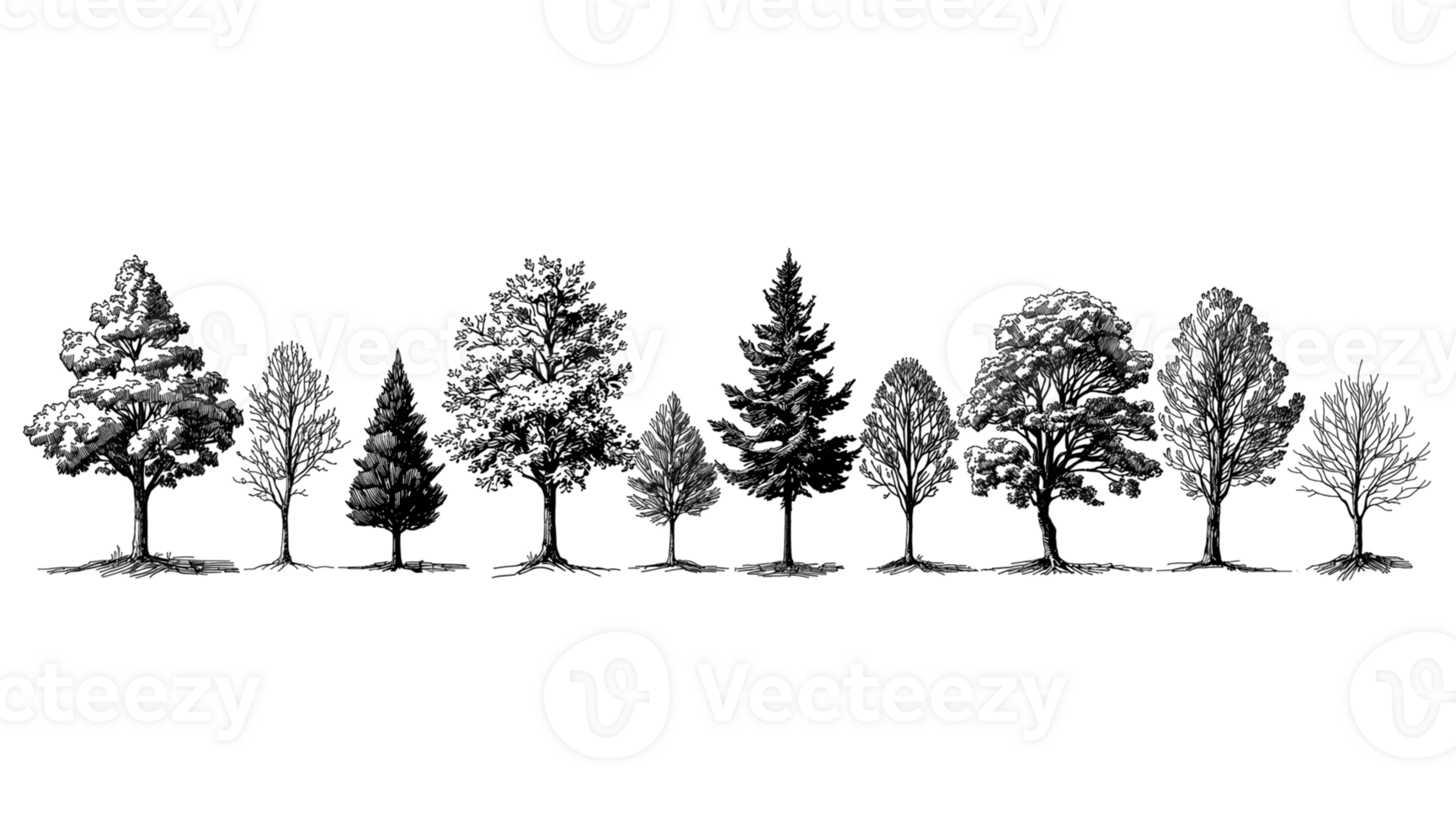 Row of Silhouetted Trees Against a Transparent Canvas, Emphasizing Texture and Shape for Design Pro PNG