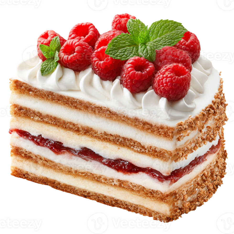 Tempting raspberry layer cake slice with cream frosting on transparent background Pro PNG