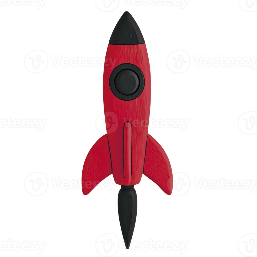 This features red toy rocket with black nose and fins, designed simple and playful style. rocket has circular window and sleek, aerodynamic shape, evoking sense of adventure and exploration Pro PNG