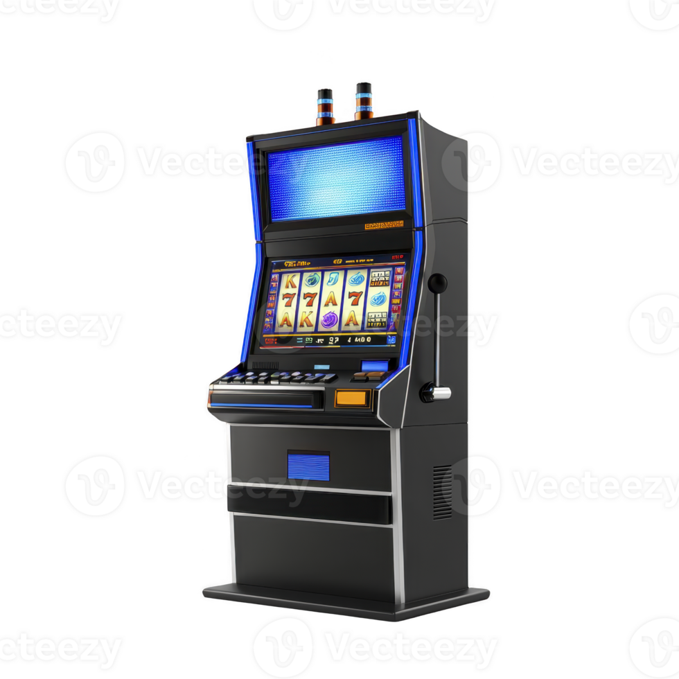 modern slot machine with sleek design and vibrant display, featuring various symbols on screen. machine is illuminated with blue lights, creating inviting atmosphere Pro PNG