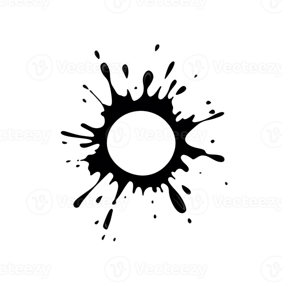 black ink splatter forms circular pattern with dynamic splashes radiating outward, creating abstract and artistic design. bold contrast against background adds striking visual impact Pro PNG
