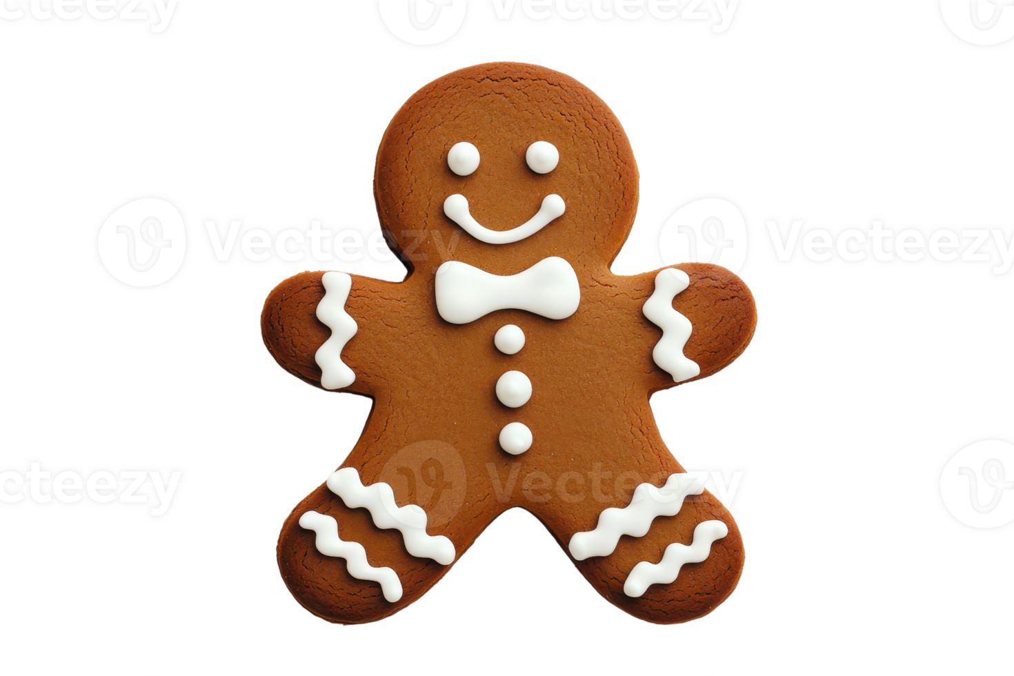 A cheerful gingerbread man cookie with white icing details, including bow tie and buttons, is displayed against plain background. cookie joyful expression adds festive touch Pro PNG