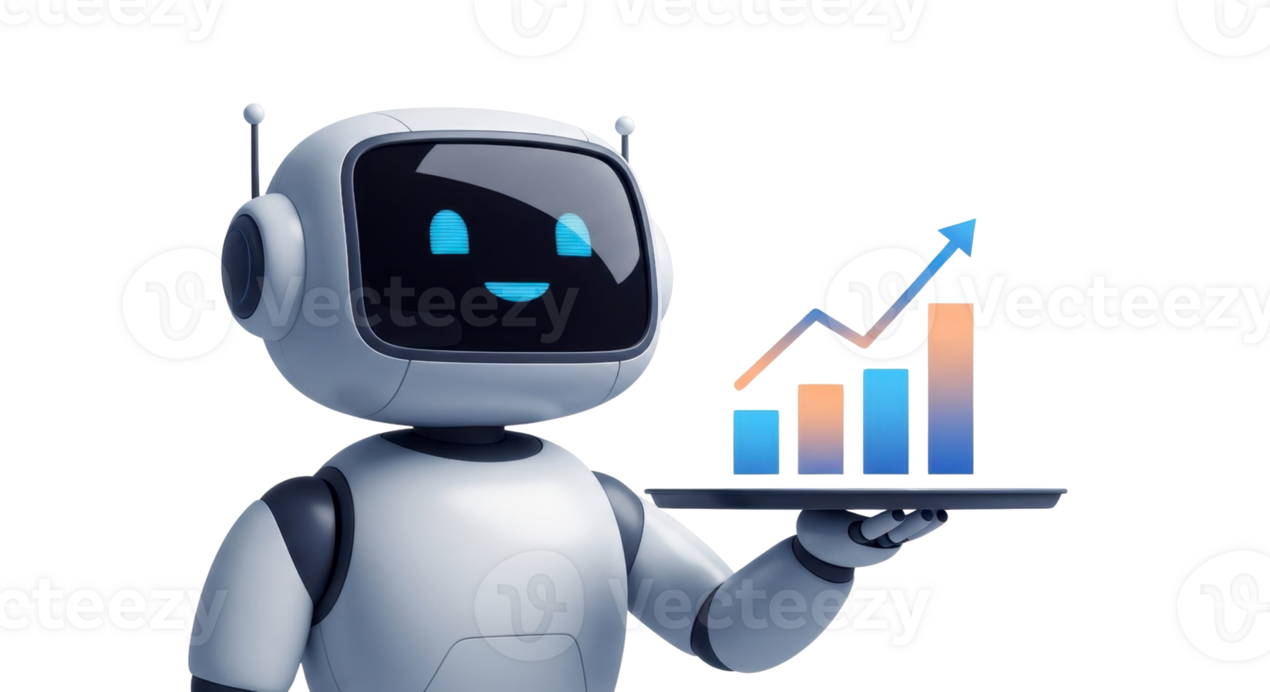 Friendly AI robot presenting an upward-trending financial growth chart, symbolizing smart data analytics, future business success, and technological advancement in automation Pro PNG