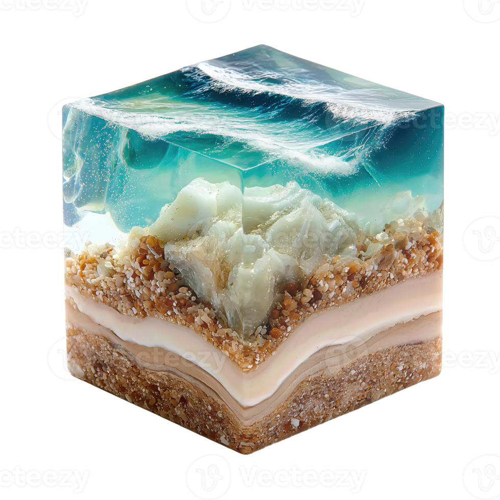 Miniature ocean resin cube showing wave and sand layers with embedded iceberg, clear aquamarine hues and polished edges, isolated on transparent background. Pro PNG