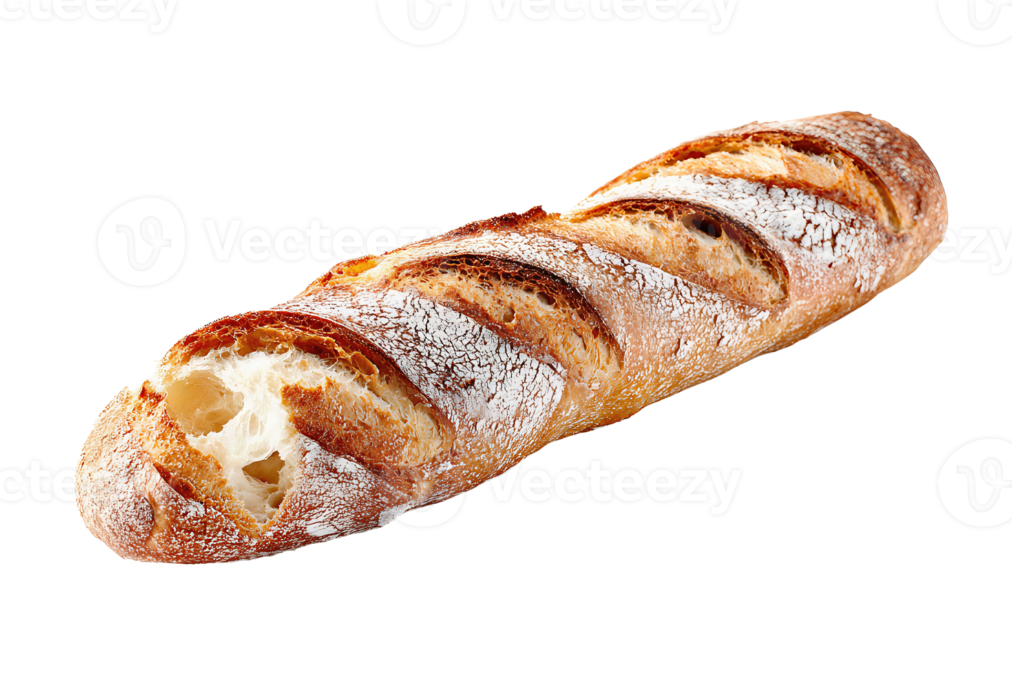 Crisp sourdough baguette with artisan scoring and flour-dusted crust, torn end exposing light crumb texture, positioned diagonally, isolated on transparent background. Pro PNG