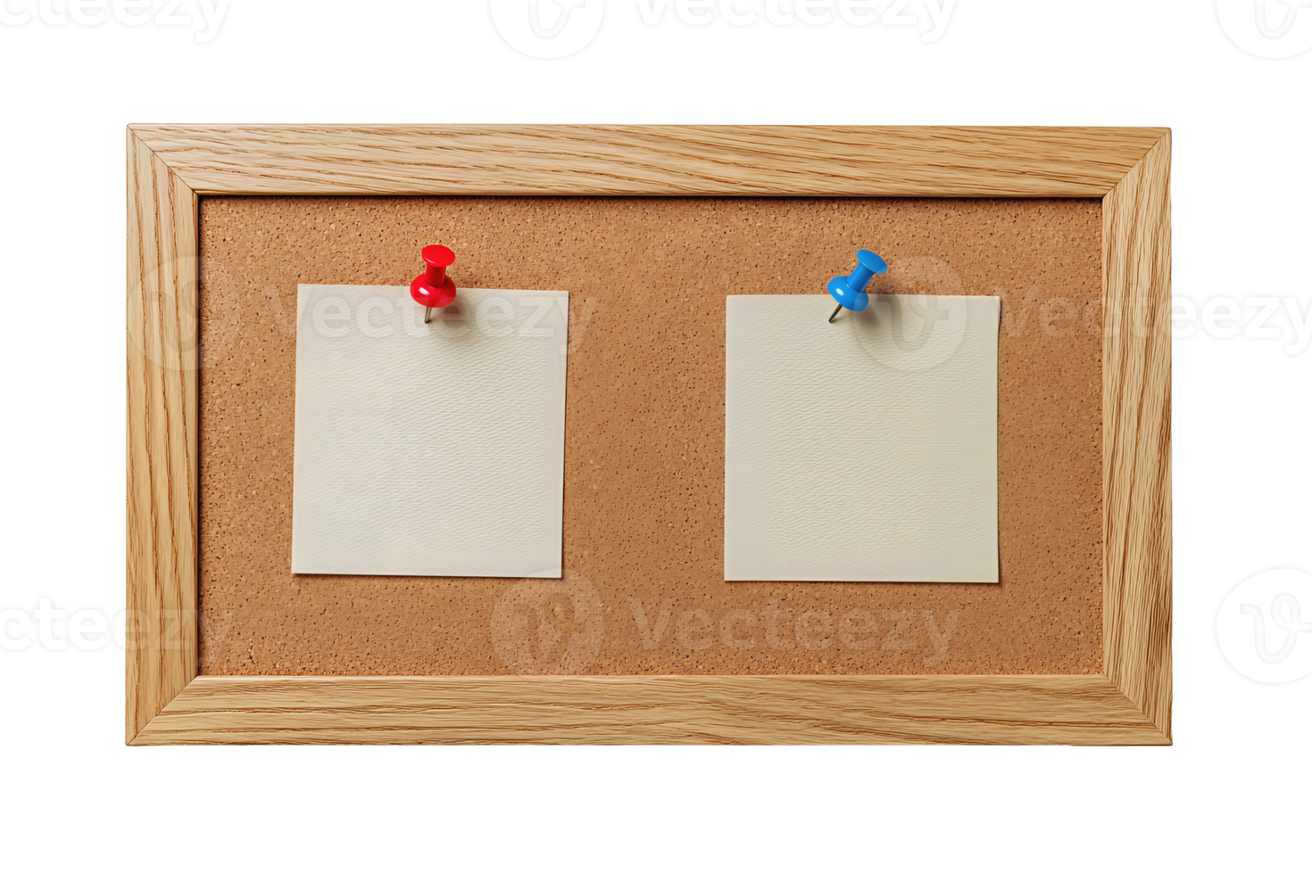 Simple oak notice frame featuring corkboard core and two pinned cream notes, red and blue pushpins adding contrast, fine wood grain visible, isolated on transparent background. Pro PNG