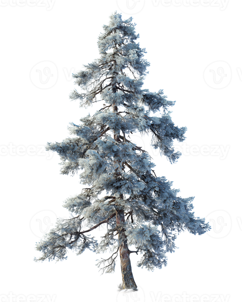 Single spruce tree featuring asymmetrical branching and a faint layer of frost, curved trunk and detailed needle structure, isolated on transparent background. Pro PNG