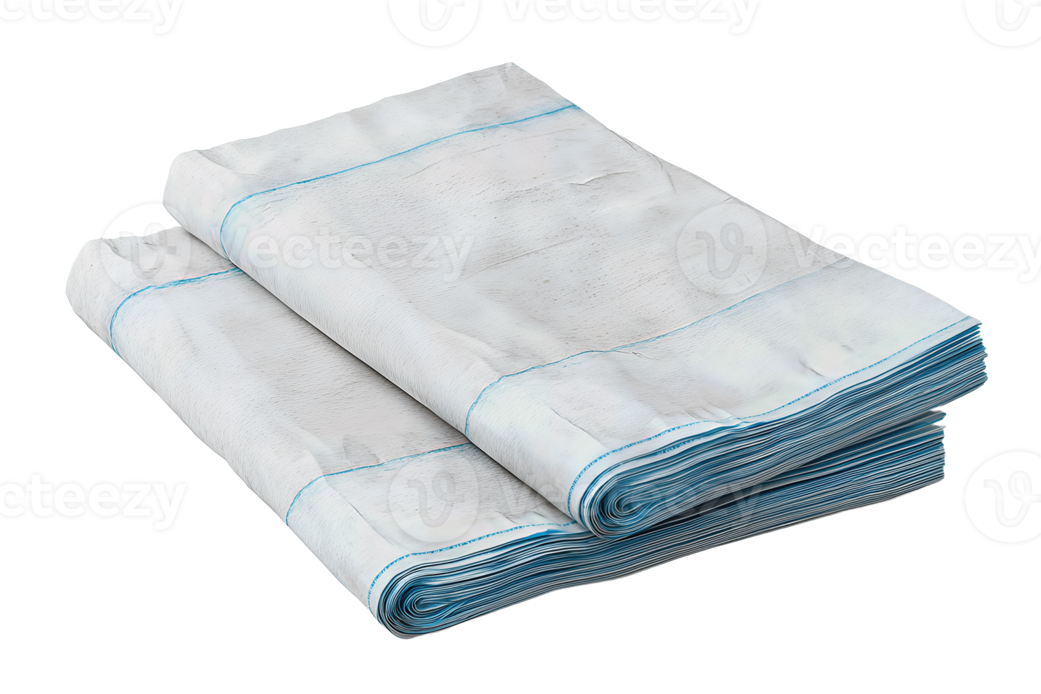 Stack of folded newspapers bound with blue strips, cool-toned pulp surface showing realistic folds and creases, minimal clean presentation, isolated on transparent background. Pro PNG